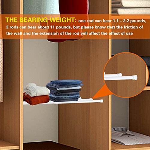 - The bearing weight: cupboard bars thickness is 0.5 mm/ 0.02 inch, one rod can bear 1.1 - 2.2 pounds, 3 rods can bear about 11 pounds, but please know that the friction of the wall and the extension of the rod will affect the effect of use