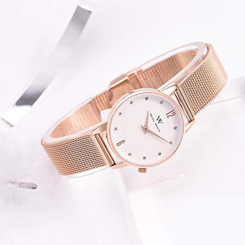 Brand, Seller, or Collection Name:WM WELLY MERCK Part Number:W-C19M5 Item Shape:Round Dial window material type:sapphire crystal Display Type:Analog Clasp:Buckle Case material:Stainless steel Case diameter:26 millimeters Case Thickness:6 Band Material:Stainless steel Band length:Women's Standard Band width:12 millimeters Band Color:rose gold Dial color:White Special features:design for small wrist Movement:Swiss quartz Water resistant depth:164 Feet