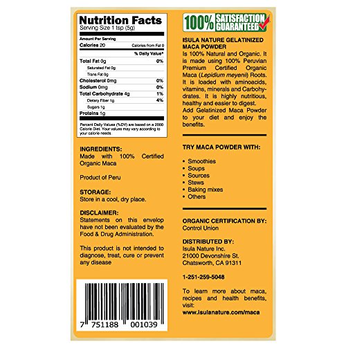 -. Title : Isula Nature Peruvian Best Organic Maca Powder 8 Ounces Bag, Gelatinized From Raw (Enhanced Absorption), Non-GMO, USDA-Organic Certified