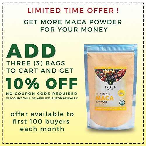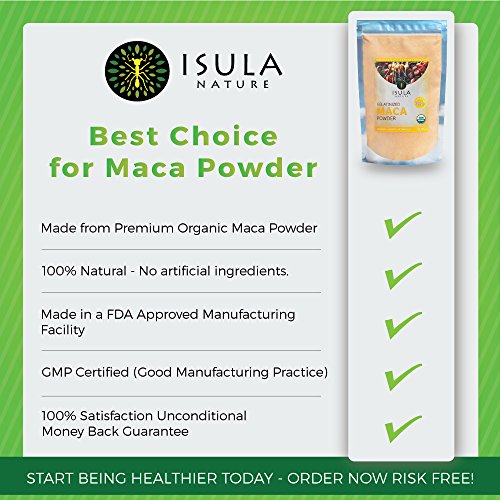 -. Feature : EASY TO DIGEST. Raw maca has been associated with stomach discomfort; our Maca Isula Nature Organic Gelatinized Powder is made out of premium maca root and uses a simple process called gelatinization, which makes maca easier to digest and improves absorption. / DELICIOUS & VERSATILE: Easy to add to many snacks and meals! You can can add it to your smoothies and juices as well as soups, stews, energy bars, oatmeal, baked goods and even cereal! / A NATURAL SOURCE OF ENERGY FOR THE WHOLE FAMILY: Known for its legendary ability to deliver energy, vitality and mental clarity, the ancient Peruvian culture used maca for centuries to promote stamina and overall health in men and women. Modern science recognizes it as a hormone-balancing substance and a highly nutritious source of essential amino acids, fatty acids, vitamins and minerals. / PERFECTLY SAFE FOR CONSUMPTION: Organic maca powder is a true superfood: 100% natural, 100% vegetable, and cultivated by small Andean growers using ancient, organic agricultural techniques. / 100% SATISFACTION GUARANTEED: There is absolutely no risk involved in this purchase. If you don't like our Maca supplement you will receive a full refund - no questions asked.