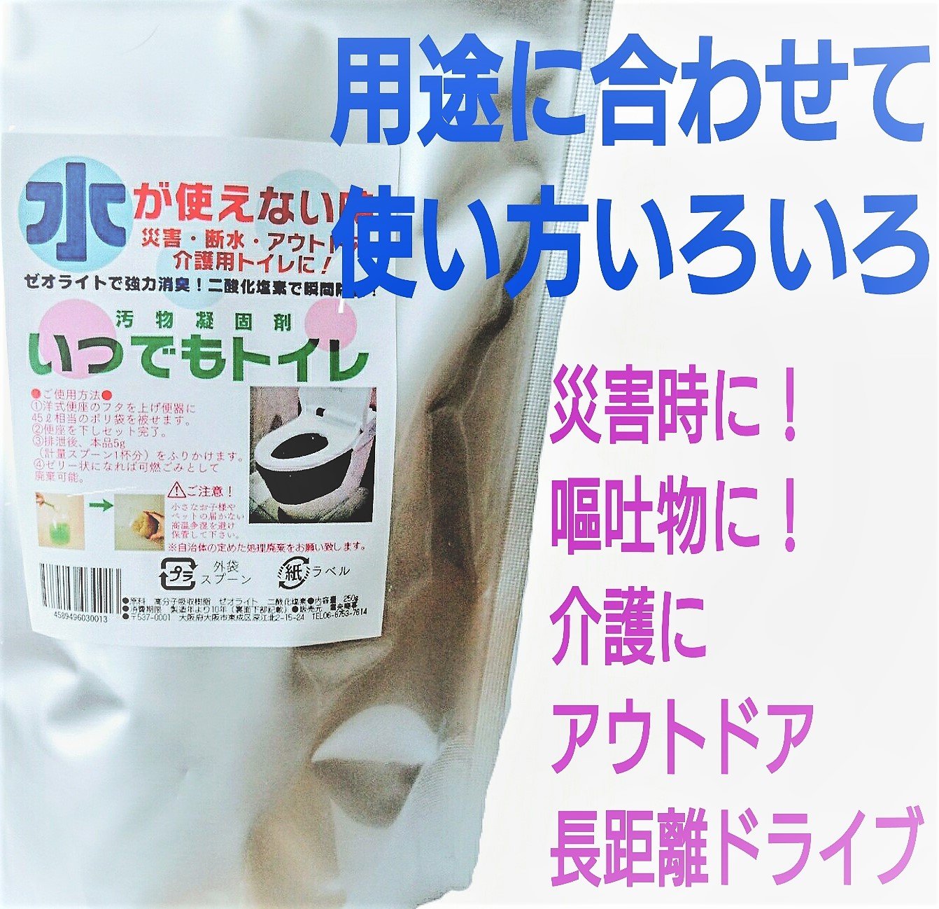 For disasters · water outage · outdoor · long time drive · simple toilet for nursing care, the most troubles in case of emergency are toilets.
