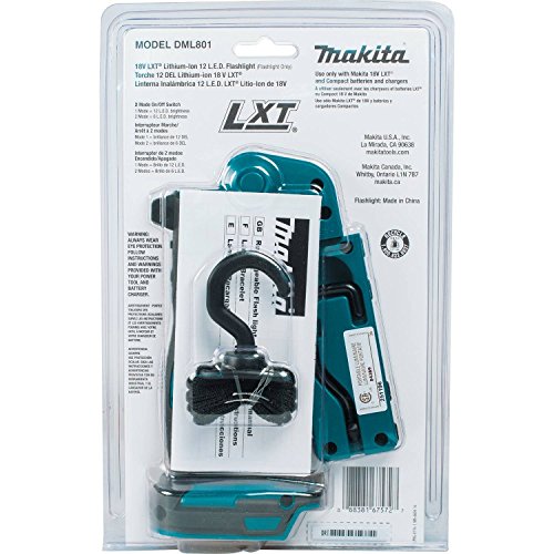 Studio : Makita Publisher : Makita Binding : Tools Home Improvement Product Description The 18V LXT Lithium-Ion Cordless 12 LED Flashlight (model DML801) provides ultra-bright illumination, versatility, and convenience. At full brightness (12 LED), it provides 240 lumens of light. 0