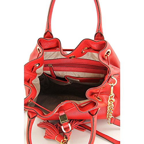 -. Brand : -. Color : Red -. Department : womens -. EAN : 0888235854625 -. Feature : 14" W x 12" H x 5" D / Double handles with 5-1/2" drop; adjustable strap with 20-1/2"-22-1/2" drop / Exterior features gold- or silver-tone hardware and logo medallion / Interior features 1 zip pocket, 3 open pockets, 1 cell phone pocket and 1 key fob / Magnetic closure -. PackageQuantity : 1 -. ProductGroup : Shoes -. ProductTypeName : HANDBAG -. Size : 14" W x 12" H x 5" D -. Title : Camden Large Drawstring Satchel Red Leather -. UPC : 888235854625