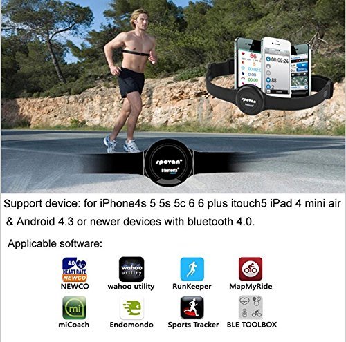 -. Feature : Wireless chest strap to monitor your heart rate. / Support device: iPhone4s 5 5s 5c 6 6 plus itouch5 iPad 4 mini air & Android 4.3 or newer devices with bluetooth 4.0. / Applicable software: NEWCO, wahoo utility, RunKeeper, MapMyRide, mi, Endomomdo, Sports Tracker, BLE TOOLBOX. / 3ATM waterproof. / Wireless Heart Rate Monitor Spovan Chest Strap Belt