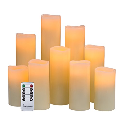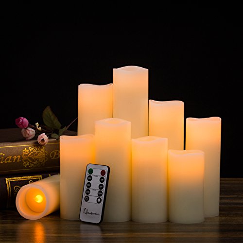 Flameless Candles Battery Operated Candles H 4" 5" 6" 7" 8" 9" Real Wax Pillar Flickering LED Candle with 10-key Remote and Timer Control by Hausware, Set of 9 (Ivory Color)