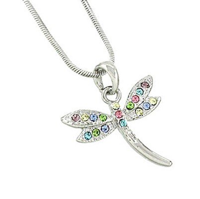 Cute Little Pink, Green, Purple, Yellow, Blue Crystal Dragonfly Silver Tone Necklace for Girls and Teens