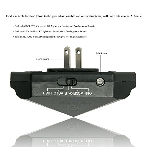 -. Feature : HIGH FREQUENCY ULTRASOUND that repels roaches, bugs, insects, mosquitoes, flies, ants, cockroach, mice and rats. / To keep mosquito and rodents from becoming accustomed to the sound, the BONAZZA ultrasonic pest repeller control device emits ultrasound at VARYING VOLUMES (peaking at 100dB) and VARYING FREQUENCIES (ranging from 15 to 26 kHz). / 2 SPEAKERS for 2 TIMES the output and coverage compare to many other electronic rodent repeller. / Environmentally friendly, does NOT pose any health risk to users and non-rodent pets like dogs, cats, birds and fish.. / This ultrasonic mouse repellent is BEST to use INDOOR in LARGE SIZED ROOMS, warehouse, garage, attic and basement.