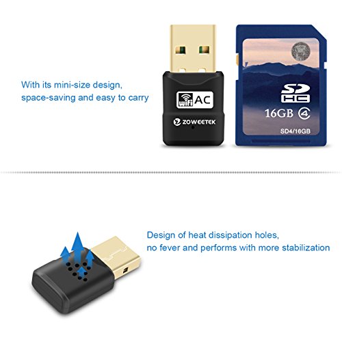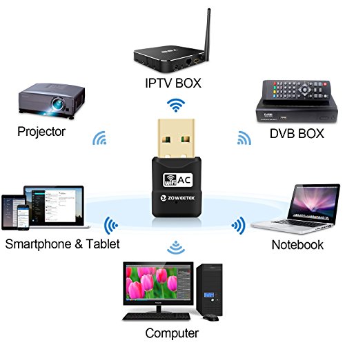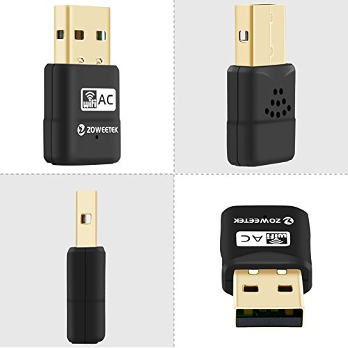 Studio : Zoweetek Publisher : Zoweetek Binding : Electronics Product Description Function: Receive Signal (Station Mode): As a Wi-Fi receiver, plug into your computer or laptop, then connect your computer or laptop to a wireless network. Transmit Signal (AP Mode): As a Wi-Fi transmitter, plug into your computer or laptop, then creat a Wi-Fi hotspot for your other wireless devices. Main Features: 1. Complies with IEEE 802.11ac , IEEE 802.11a,IEEE 802.11n, IEEE 802.11g and IEEE 802.11b standards. 2. The 5GHz 433Mbps is perfect for HD video streaming and lag-free online gaming, while using 2.4GHz 150Mbps Wi-Fi for normal use such as web surfing. 3. Mini size avoiding hit. Hest dissipation holes maintain efficient work. 4. Easy to install and set. Technical Parameters: Standard: IEEE 802.11 b/g/n 2.4GHz, IEEE 802.11 a/n/ac 5GHz Wi-Fi Performance: AC600Mbps (2.4G 150M / 5G 433M) Work Channels: 13 channels at 2.4GHz, 9 channels at 5GHz. (Only AP mode can choose 2.4Ghz or 5Ghz wireless channel but Station Mode can connect to 2.4Ghz or 5Ghz wireless channel WiFi) Support Systems: Windows XP/Vista/7/8/10,Mac OS X 10.6-10.12 and Linux Special Notes: 1. Under the AP Mode, its WiFi speed isn't over your ethernet max speed. Under the Station Mode, your computer network speed isn't over the WiFi max speed. 2. If you use this dongle on Linux, please refer to this video: https://www.youtube.com/watch?v=XJ0gcA778Ms 3. If you can't use the disk, please email Zoweetek Customer Service to get driver file. Packing list: 1 * usb wifi adapter 1 * CD 1 * Manual 1-year warranty 0