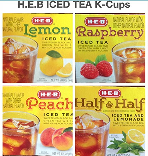 -. Binding : Misc. -. Brand : HEB -. EAN : 0041220884339 -. Feature : Half & Half - Sweetened black tea with lemonade flavor / Raspberry - Sweetened black and green tea with a hint of raspberry flavor. Natural flavor with other natural flavor. 2.0 compatible. 12 single cups. Compatible with Keurig K Cup Brewers. Packed in USA. / Lemon Iced Tea -Sweetened black and green tea with a hint of lemon flavor / Peach Iced Tea - Sweetened black and green tea with a hint of peach flavor / Compatible with Kuerig machine -. PackageQuantity : 4 -. ProductGroup : Grocery -. ProductTypeName : GROCERY -. Title : H.E.B Variety Iced Tea k-cup (Half and Half Iced Tea & Lemonade; Raspberry Iced Tea; Lemon Iced Tea; Peach Iced Tea) 48 counts -. UPC : 041220884339