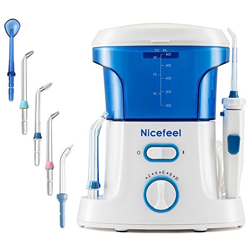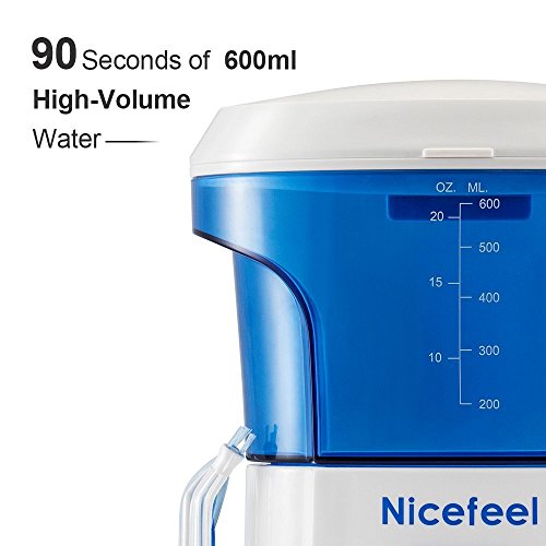 With powerful pulsation, the Nicefeel water flosser proved to be more effective than toothbrush and dental floss. The combination of 10 water pulsations is customized for a more comfortable using experience. It removes debris and bacteria lodged deep between teeth and below the gum-line. High volume 600ML water capacity works for at least 90 seconds continuous flossing. The 360° Rotating direction control knob can adjust angle for cleaning all areas of your oral. Significant oral health benefit for people with braces, implants, crowns, bridges, and veneers etc.