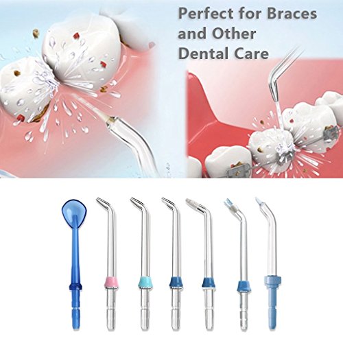 7 Unique Tips included to meet varying needs and come with a lid cover, keep the tips away from dust. 1) 3 Ordinary High-Pressure Tips with 3 color ring for general use. Best for nightly cleaning. 2) 1 Tongue Cleaner Tip for fresh breath. Scrape and flush gently for removing bacteria and sulfur compounds. 3) 1 Periodontal Tip for periodontal pockets. Designed for rinsing deep below the gumline. 4) 1 Orthodontic Tip for braces carriers. Flush out food debris bacteria from around the teeth and under the gums. It also removes hard-to-reach plaque around orthodontic brackets and wires. 5) 1 Dental Plaque Tip for implants, crowns, bridges and other restorations. It has 3 thin tufts of bristles to access stubborn plaque around implants, crowns, bridges and other areas that are susceptible to plaque accumulation.