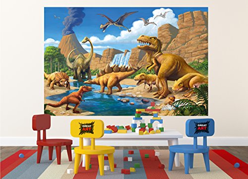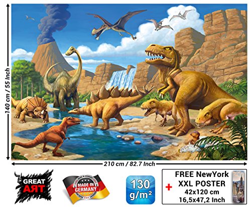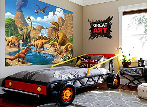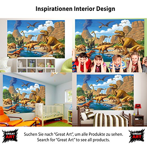 Wallpaper Childrens Room adventure Dinosaur – wall picture decoration Dino World Comic style jungle adventure Dinosaur Waterfall I paperhanging Wallpaper poster wall decor by GREAT ART (82.7x55 Inch)