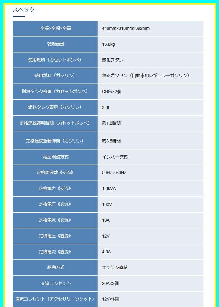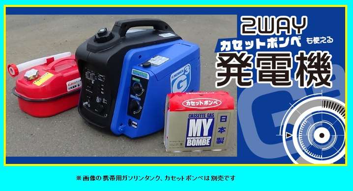 ●カセットボンベでもガソリンでも使える2WAYの携帯発電機です。15kgという女性でも使いやすいコンパクトさとスタイリッシュなボディに仕上げました。カセットボンベ、ガソリンともに1kVAも実現し、アウトドア・屋外作業・災害時などに役立ちます。