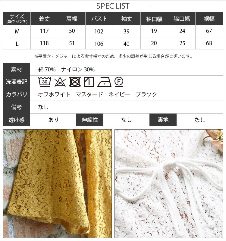 L:着丈 118cm 肩幅 51cm バスト 106cm 袖丈 40cm 袖口幅 20cm 脇口幅 25cm 裾幅 68cm