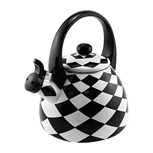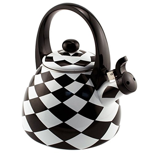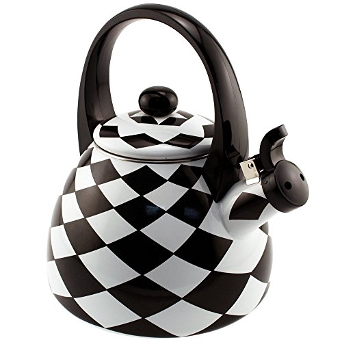 Add some whimsy to your kitchen with this fun and functional tea kettle from Supreme Housewares. Made of heavy gauge stainless steel, it has an enamel finish. With a black and white checkered diamond pattern, it is a traditional kettle that whistles when your water has boiled. It also has an arched handle, and should be washed by hand to preserve its design.8" W x 11" H, with a 2.5 quart capacity