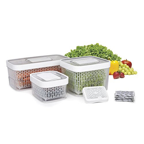 Fruits and vegetables give off ethylene gas. Exposure to this gas speeds up the ripening process in neighboring produce in a container or Crisper, causing it to spoil faster. GreenSaver’s all-natural, non-toxic activated carbon filters are filled with nooks and crannies that trap and absorb ethylene gas, slowing down spoilage and keeping fruits and vegetables fresh longer. These filters are for use with OXO Good Grips GreenSaver Produce Keepers or Crisper Inserts. Carbon filters last 90 days. To sign up for reminders when it’s time to replace your filter, or to learn more about the OXO GreenSaver line, visit greensaver{dot}oxo{dot}com