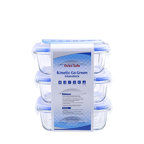 Kinetic brings you the best in food storage with their stylish and unique Go Green Glasslock Elements series designed for reheating leftovers and convenient refrigerator/freezer storage. BPA Free and FDA Approved. The durable 6 piece Glass Food Storage Container Set includes 3 Rectangular 12oz Containers and 3 Lids. Elements features a vented plastic lid with a four tab locking system with a silicone seal that creates an airtight/watertight seal keeping foods fresh longer than ordinary food storage solutions. Containers may be used in the oven up to 450⁰ Fahrenheit without the lid. Freezer, refrigerator, and microwave safe with lid attached; the set promises easy cleanup in the dishwasher (top rack recommended for the lids). Bake or reheat food and take the container directly to the table. This simple and elegant design keeps kitchen leftovers organized neatly and with a minimum of fuss. Stackable durable containers optimize your storage space in the refrigerator or cupboard and also nest to save space. Out of box product dimensions in inches: 12oz = 6x4.25x2 1 Year Limited Manufacturer Warranty