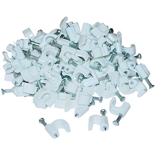 RG6 White Cable Clip, 100 Pieces per Bag Product Details: Color:show as picture.Color: WhiteWeight: 0.5 lbsModel number: CNE41343Use these cable clips to organize your cables into one uniform area. Comes with nails to mount to various surfaces. 6-7mm Coaxial nail-in fastenerAttaches to wood, concrete, brick, masonry, plasterZinc-plated pre-inserted Hardened steel nailHigh-impact plasticFeature