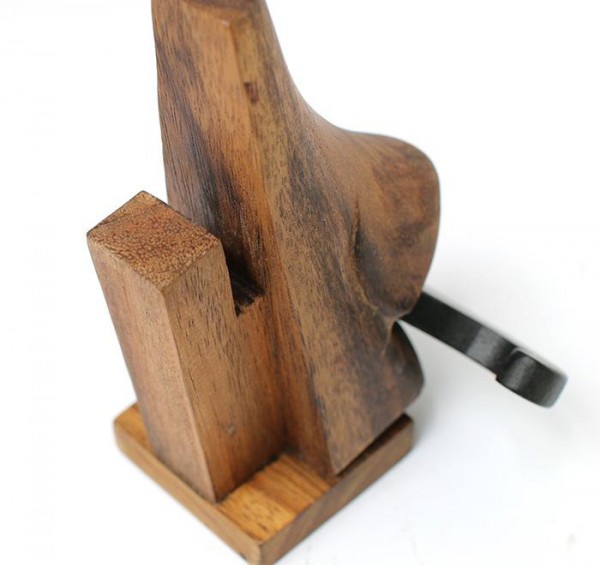木のぬくもり感じる、ちょっと変わったデザインのメガネスタンドです。メガネを置くと、まるでメガネをかけているよう。
