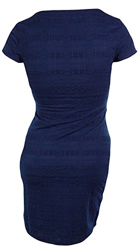 Dress features no lining, scoop neckline, short sleeves, knit textured stretch fabric, and pullover style.