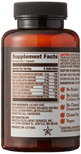 -. Feature : Contains eight B vitamins: thiamin, riboflavin, niacin, B6, folate, B12, biotin, and pantothenic acid / - 83% whole food cultured / - 65 capsules / - 2 month supply (taken daily at the listed serving size) / - Made in a Good Manufacturing Practices facility / - An Amazon brand
