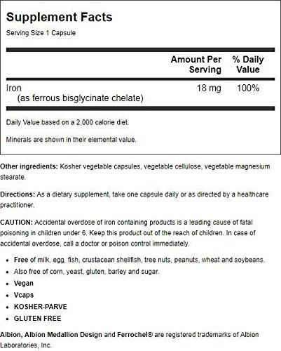 Product DescriptionIRON 18 mg. Vcaps Non-constipating gentle Albion Ferrochel® iron supplement. Available in easy-to-swallow vegetable capsules for maximum assimilation and absorption.0