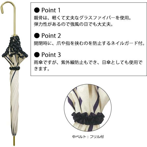 fk094igrjs裾やベルトにフリルを施した、お嬢様風デザインゴールドの持ち手もポイントです サイズ (約)親骨:58cm、傘の直径:90cm 個装サイズ:7.0×71.0×7.0cm 重量 約265g 個装重量:350g 素材・材質 親骨:グラスファイバー(8本使用) 生地:ポリエステル 仕様 開閉:手開き 深張り 生産国 中国 ストライプ×フリルデザインの、深張りタイプの長傘 裾やベルトにフリルを施した、お嬢様風デザインゴールドの持ち手もポイントです