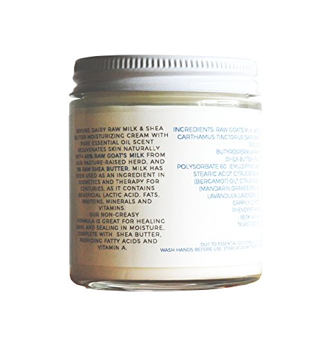 Skyline Dairy farmstead Raw Milk & Shea Butter Moisturizing Cream with your choice of pure essential oil blend protects and moisturizes skin naturally with (40%) raw goat's milk from pasture-raised herd, (5%) raw shea butter, and safflower oil. The rich, creamy formula smooths easily onto skin, and is fast-absorbing, light, and clean. Perfect for face and body, our cream protects and strengthens skin's natural moisture barrier, while fighting free radicals and aiding in natural reparative processes, softening skin and enhancing elasticity, reducing wrinkles and general signs of aging. This formula gives you the soft skin you want without dyes, synthetic fragrances, or harsh chemicals. The cream comes in an attractive glass jar that is reusable, or recyclable. With milk as the truly beneficial base ingredient (about 1.6oz. per 4oz. jar) and locally-sourced pure essential oils for scent and therapeutic benefits you may love this moisturizing formula like many others have!Feature