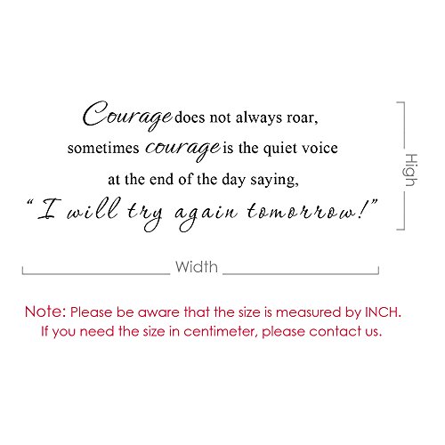 -. Binding : Kitchen -. Brand : WallPlaza -. Feature : We have up to 18 colors in MATTE finish to choose. If you have any specicial request please feel free to contact us. / Generally we offer 2-4 sizes to choose,and please be aware the size is measured by "INCH". / The wall decal will come with the transfer tape pre-covered. Just peel off and apply in one step. / We use high quality vinyl and RTape transfer tape to ensure the wall decal you receive is 100% environmental-friendly. / Please be aware that the wall decal cannot be applied to new painted or textured wall. -. Label : WallPlaza -. Manufacturer : WallPlaza -. ProductGroup : Home -. ProductTypeName : HOME -. Publisher : WallPlaza -. Studio : WallPlaza -. Title : Courage does not always roar - Inspirational Wall Decal Quote For Kid's Room Study Room