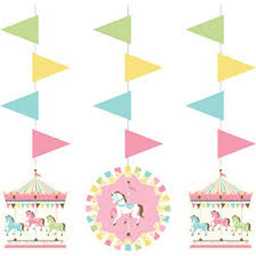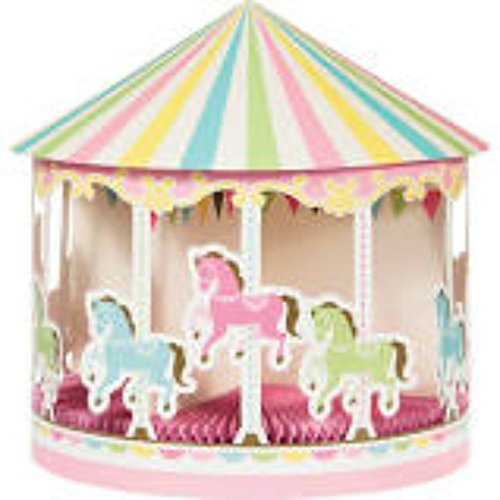 -. Feature : Carousel Themed Birthday Decorations Bundle includes: 1 Shaped Banner, 1 Foil and 10 Latex Balloons, 1 Centerpiece, 3 Hanging Cut-Outs, and 10 Photo Props. / "SET THE SCENE! The Large Banner and Centerpiece will let everyone know what this party is all about! Shaped Banner is P.R.Inted on cardstock, measures 8 feet long and is easily hung on a wall, along a mantel, across a party table. Features bold gold foil lettering each with its own banner and a central gold foil unicorn and reads ""Happy Birthday""! Honeycomb Carousel Shaped Centerpiece measures 12"" x 12"" and features a miniture replica of a beautiful pastel rainbow carousel. " / FESTIVE BALLOONS! Round metallic balloon is approximately 18-inches inches in diameter and features a white carousel horse against a pink background surrounded by a pastel rainbow border. Also included are 10 Latex Balloons 2 of each coordinated color: Yellow, Fresh Mint, Classic Pink, Candy Pink, and White. All balloons are shipped flat and ready to be filled with helium or air. / ANOTHER DECORATING DIMENSION! Hanging Cut-Outs include 3 cardstock streamers with banners, carousel and horse medallions. Decorations hang at approximately 36". Easy to store hanging cut-outs ship flat, just lift hanging loop to decorate with 3 dimensional fun. / STRIKE A POSE! 10-Piece Caarousel Birthday themed Photo Booth Props are die-cut from card stock and attached to sturdy 10-inch sticks. Props include Unicorn horns, Rainbow hair, Stars and Star Glasses and Word Balloons. Pose with friends and family for silly party photos; props can double as table decorations. These days, a party's not a party without a photo booth!