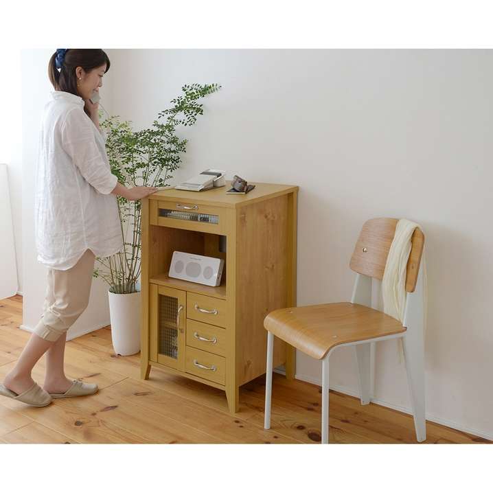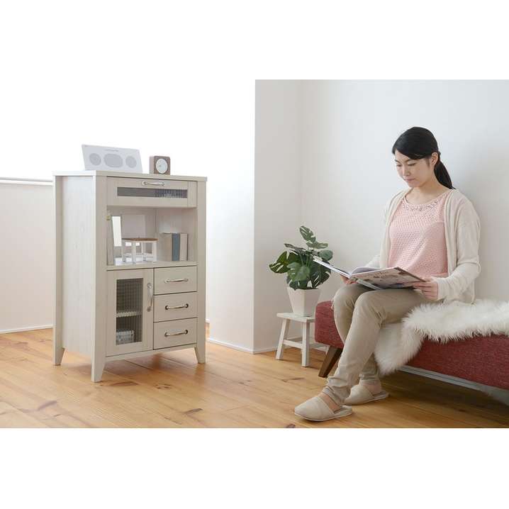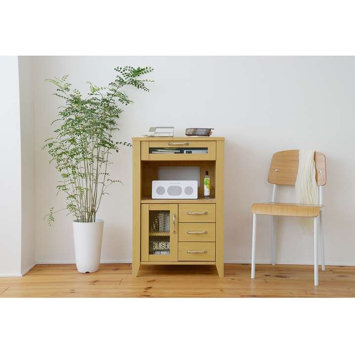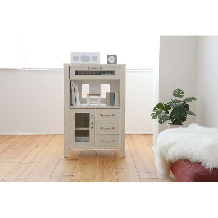 ●浅めの引出しが1杯、小さめの引出しが3杯、小さめガラス扉収納が1ヵ所、広めのオープン部が1ヵ所と、様々なスペースがありマルチに使っていただけます。