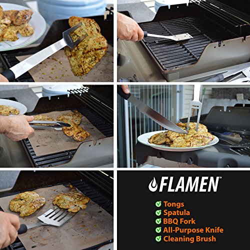 - This set includes tongs, spatula, barbecue fork, all-purpose knife & cleaning brush