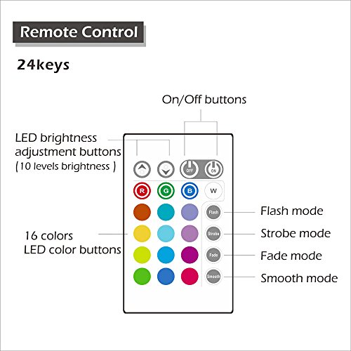 【16 Colors, 4 Flash Mode】- With 24 keys remote control(Include battery), you can adjust the brightness on single 16 single color mode, and the flash speed on 4 flash mode.