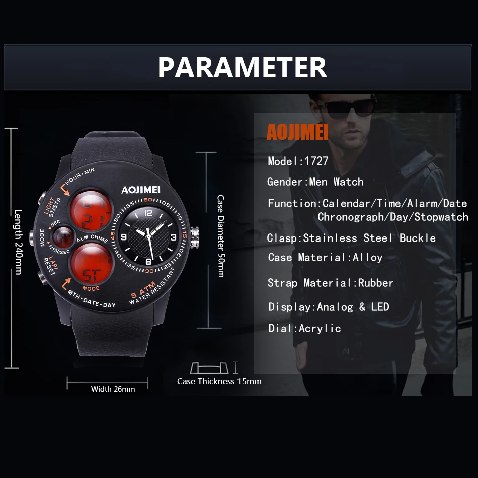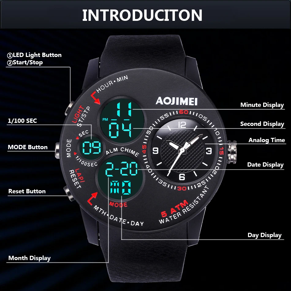 Feature:Water Resistant,LED display,Multiple Time Zone,Stop Watch,Complete Calendar,Shock Resistant,Chronograph,Auto Date,Anti-magnetic,Alarm