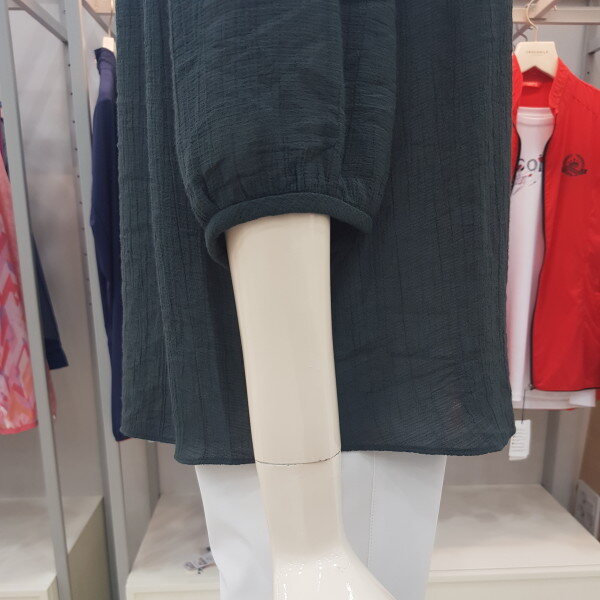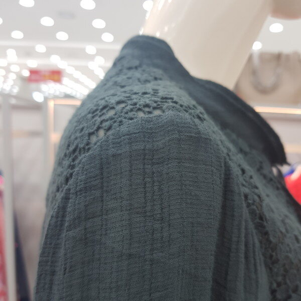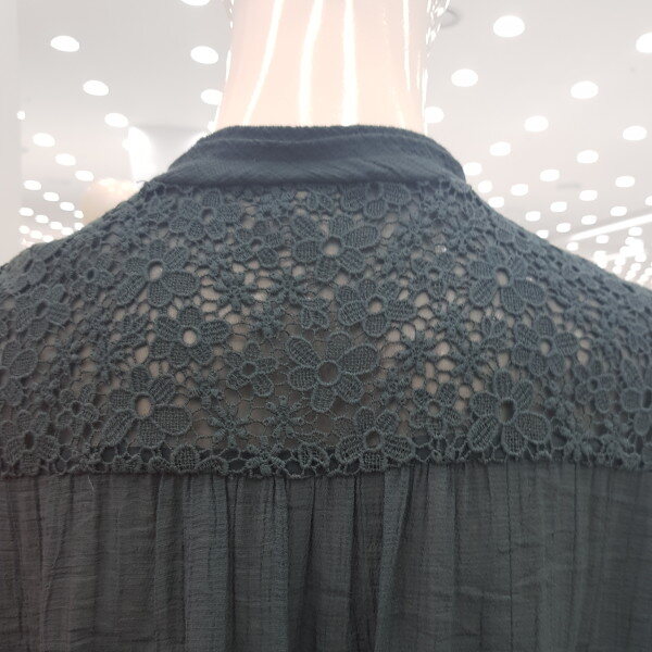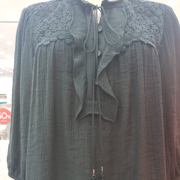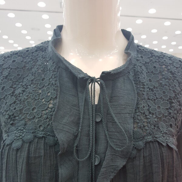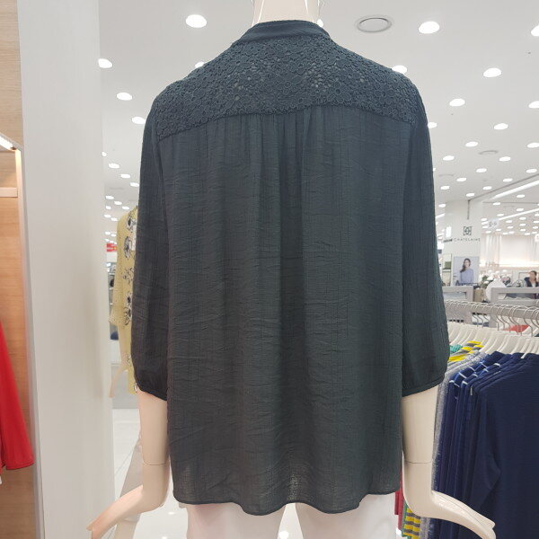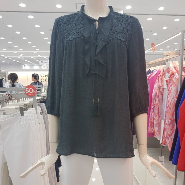 조직감이 있는 레이온 소재의 블라우스, 앞 요크에 레이스 배색과 테슬 장식으로 포인트를 준 여성스러운 블라우스.