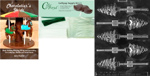 Cybrtrayd 45stK25GRBk-C035 Christmas Tree Lolly Chocolate Mold with Chocolatier's Bundle of 25 Lollipop Sticks, 25 Cello Bags, 25 Green Twist Ties and Chocolatier's Guide