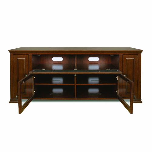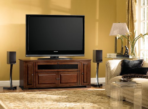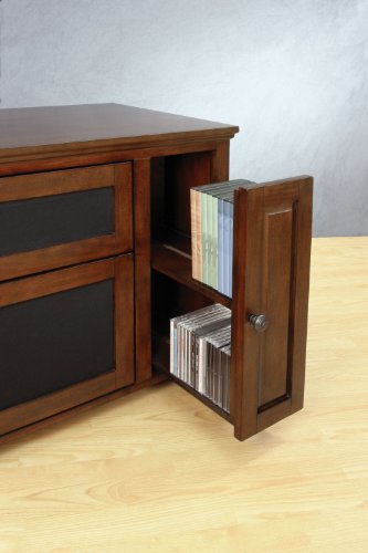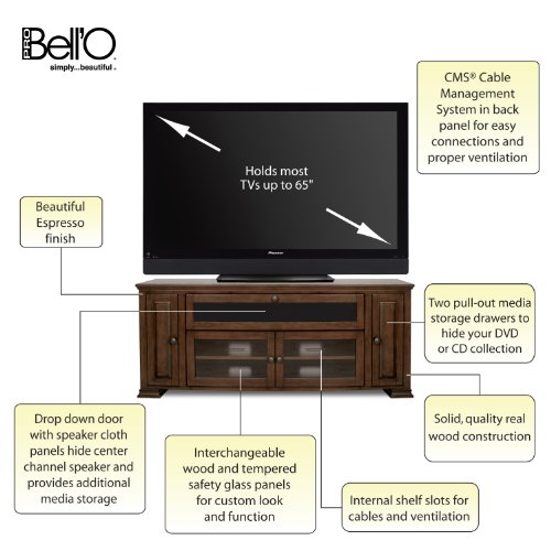 - Feature : Beautiful Rich Espresso Finished Wood Cabinet will hold up to a 65" Flat Panel or Micro Display Television / Accommodates your Center Channel Speaker behind a drop down door covered in Speaker Cloth. Two front cabinet doors with optional Glass or Wooden Front Panels and two pull out Media Drawers to store your DVD or CD Collection neatly. / Unit features a flow-through ventilation system and a CMS Cable Management System to hide all Wires and Interconnect Cables. / Very Sturdy Audio Video Cabinet comes fully assembled. / For more Audio-Video Furniture, Wall Mounts, Cables, and Accessories options by Bell'O go to bello.com / Accommodates most flat panel or micro display TVs up to 65" / Accommodates 4 or more AV components and a center channel speaker / 2 pull-out media drawers for storing DVD or CD collection / Removable back panels for easy access to AV components / Includes glass, speaker cloth and solid wood door panels for a custom look, product ships assembled