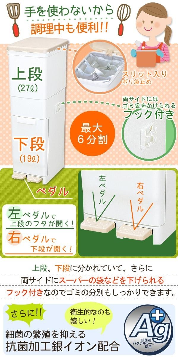 調理中や皿洗い中、手を汚したくない時に便利☆ペダルを踏めばゴミ箱の蓋が開け閉めできるダストボックスです。上段・下段に分かれており、更に両サイドにはスーパーの袋等を下げられるフック付!!ゴミの分別もしっかりできます。カビにくい抗菌加工銀イオン配合で衛生的♪ |
