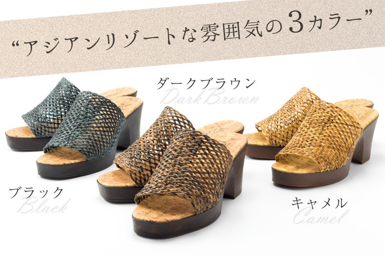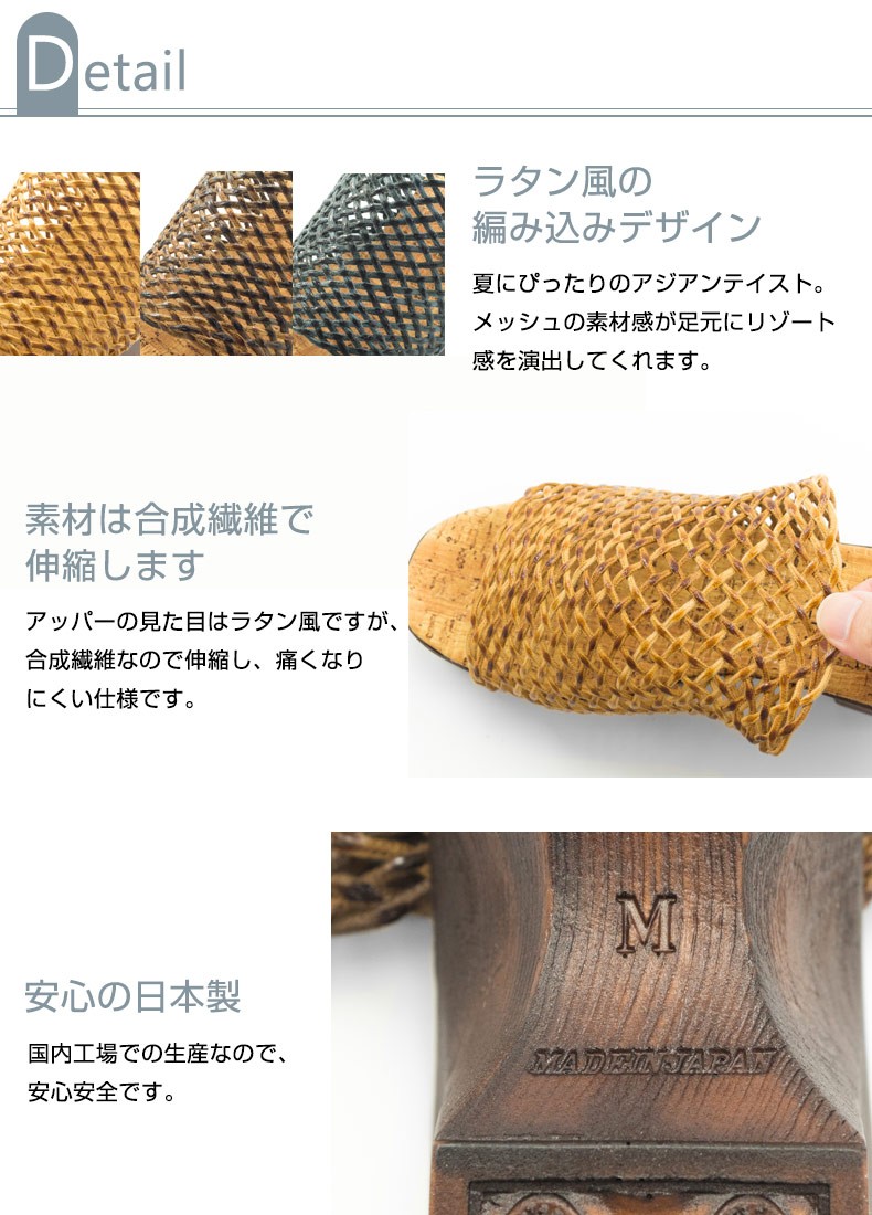 | ポイント | 【7,560円以上送料無料/あすつくOK】 ◆日本製 メッシュ ウェッジ ミュール サンダル◆ アジアンテイストの編み込みデザインがリゾート感たっぷり。 ヒールは7cmありますが、ストームも2cmあるので、高いヒールが 苦手な方でも安定して歩行できます。 ※撮影は室内で行われており、ライティングにより実物と色味が少し異なる場合がございます。 ※採寸はスタッフが手作業で行っており、少々の誤差が生じる場合がございます。 | ||