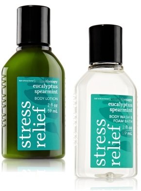 -. Binding : Misc. -. Brand : Bath & Body Works -. EAN : 0745577641019 -. Feature : Eucalyptus Spearmint travel size set body lotion 2 Oz. and Shower Gel 2 Oz / Eucalyptus Spearmint: Eucalyptus Essential Oil clears the mind while Spearmint Essential Oil uplifts / Body Lotion 2 Oz: Ultra-creamy, nourishing body lotion is formulated to give skin long-lasting moisture while an aromatherapy blend of natural ingredients and essential oils benefits body, mind & mood / Shower Gel 2 Oz: fast-foaming body wash is infused with soothing skin conditioners, while an aromatherapy blend of essential oils and natural ingredients benefits body, mind & mood. / No tested on animals -. IsAdultProduct : 0 -. Label : Bath and Body Works -. Manufacturer : Bath and Body Works -. MPN : 0745577641019 -. PartNumber : 0745577641019 -. ProductGroup : Beauty -. ProductTypeName : BEAUTY -. Publisher : Bath and Body Works -. Size : 2 Ounces -. Studio : Bath and Body Works -. Title : Bath and Body Works Aromatherapy Stress Relief Eucalyptus Spearmint Travel Size Body Lotion 2 Oz and Shower Gel 2 Oz -. UPC : 745577641019