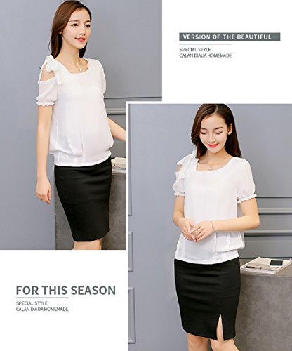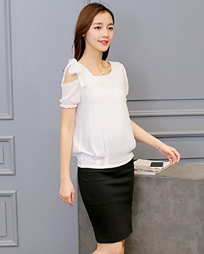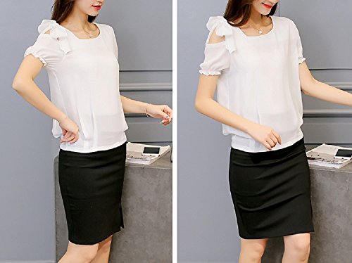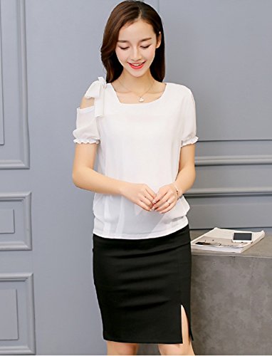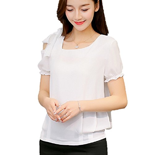 -. Title : ロイヤルパイン(Royal Pine) Uネック 肩出し リボン付き パフ袖 シフォン ブラウス アンシンメトリー (M,ホワイト)