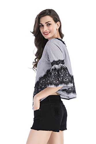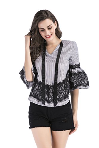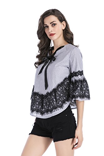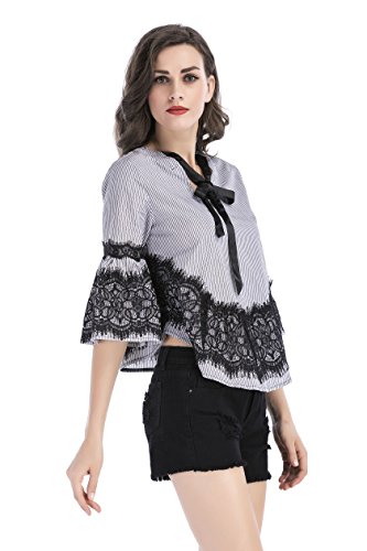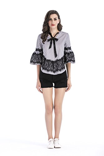 -. Title : Ellies レディース 半袖 レース チェック 蝶結び オシャレ かわいい Aライン ブラウス シャツ