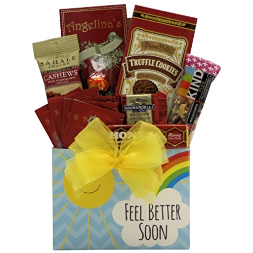 -. Feature : Show someone you care by sending this Feel Better Soon Get Well Gift Basket. / Stash's Acai Berry Herbal Tea and Honees Honey filled drops will help them on their way to recovery. / The included cookies, chocolates and snacks will put a warm smile on their face. / The perfect gift for those feeling under the weather / Dim: 12"L x 10"W x 10"H Item weight 3 Pound