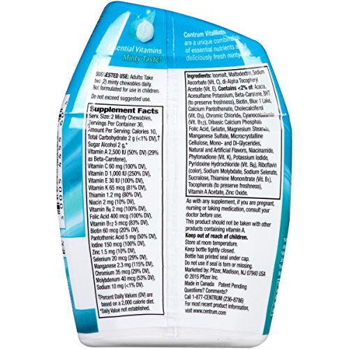 A multivitamin you enjoy like a mint- available in a Wintergreen flavor. Smooth, not chalky. And with no vitamin aftertaste! Take Centrum VitaMints multivitamins any time of day with or without food or water to provide your body with essential vitamins and minerals that support energyY=, immunity , metabolism+, and overall well-being*.