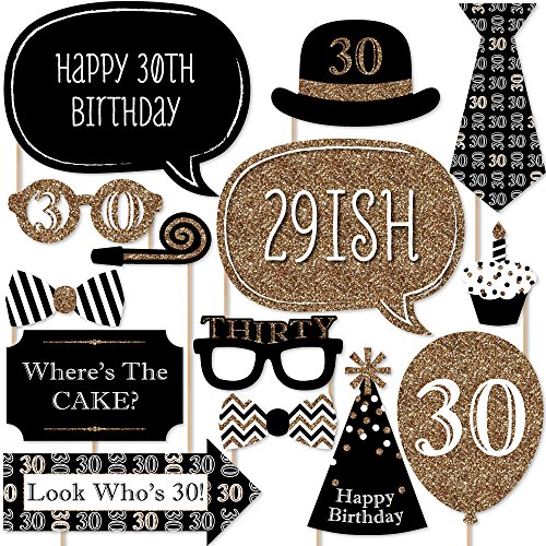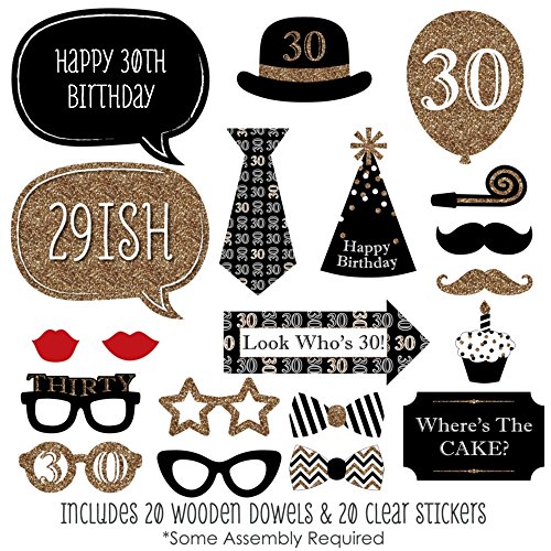 20-Piece Black and Gold Photo Booth Props Kit INCLUDES 20 Adult 30th Birthday photo booth props, 20 wooden dowel sticks and adhesives for assembly. EASY ASSEMBLY: Simply attach the printed DIY photo booth props to the wooden dowels with included adhesive and reinforcing stickers.