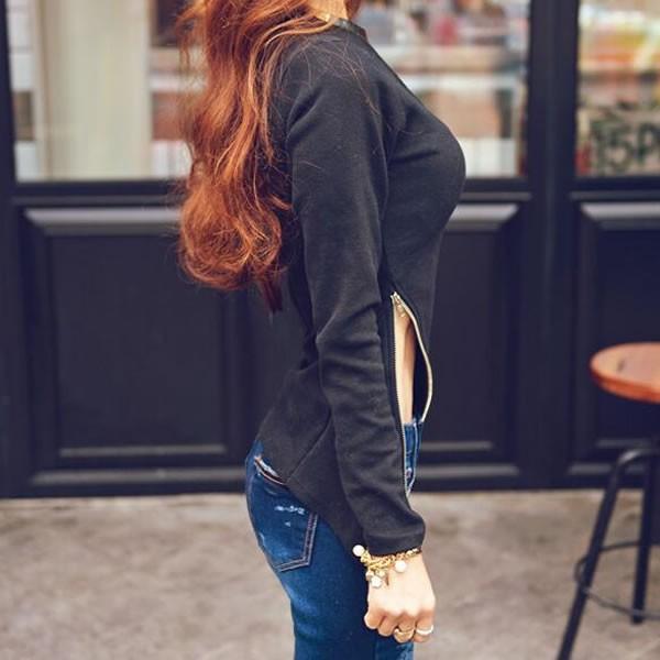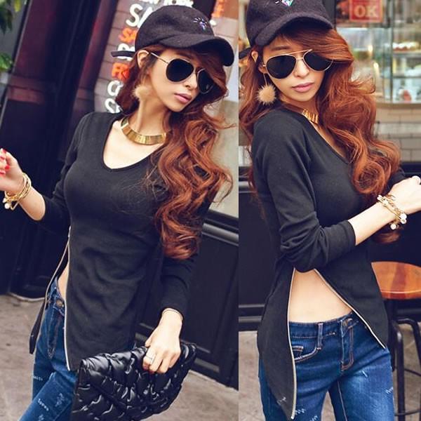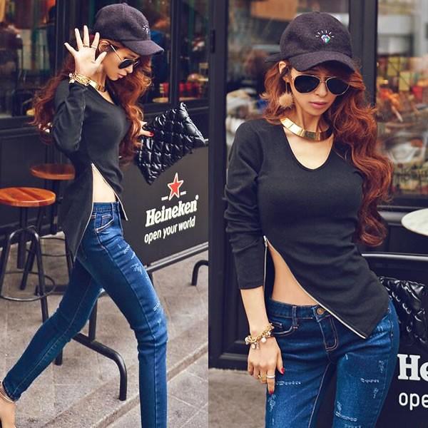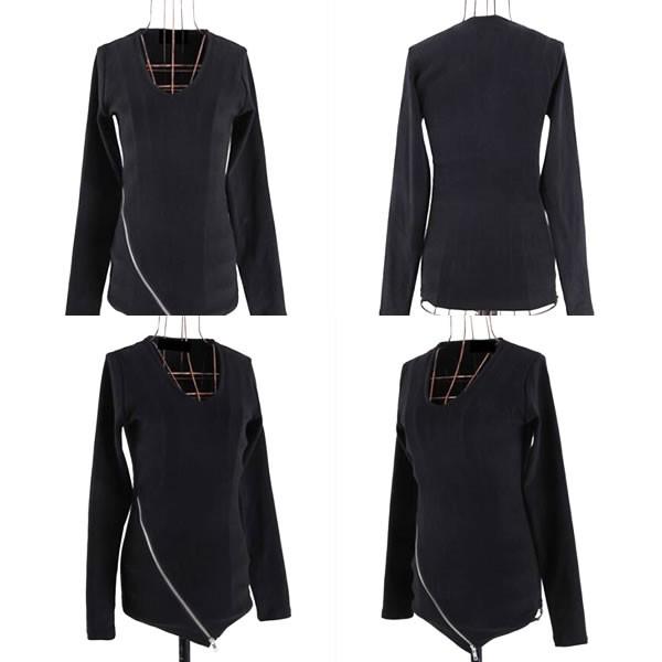 | セクシー ジッパーデザイン 変形 カットソー 長袖 黒 ブラック 無地 【カットソー トップス レディース 黒 ブラック 春 ロンデルブラック セクシー トップス 長袖カットソー sexy sizemini】 | |