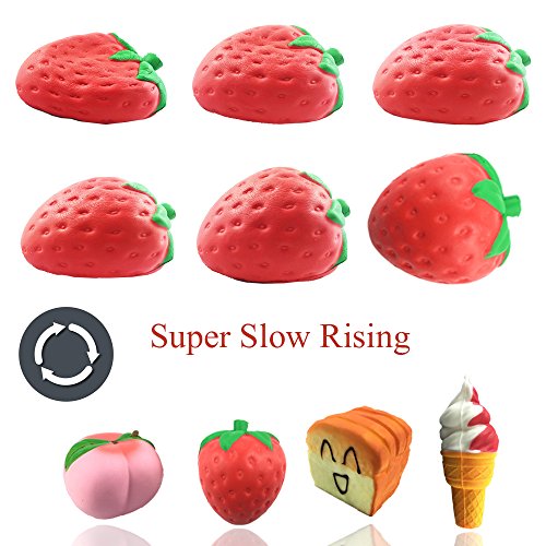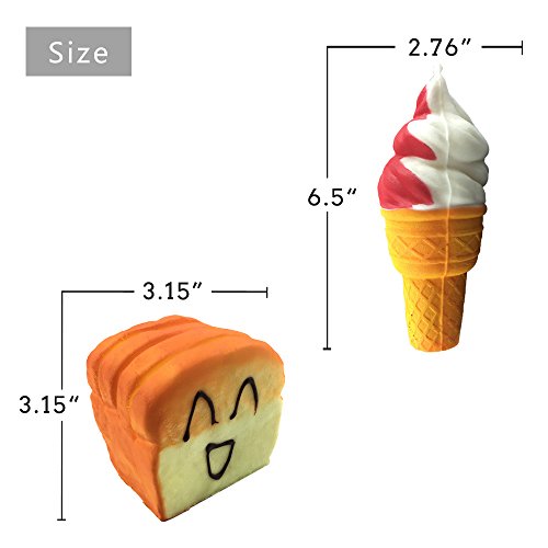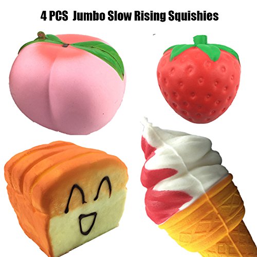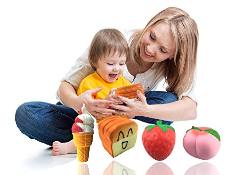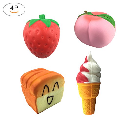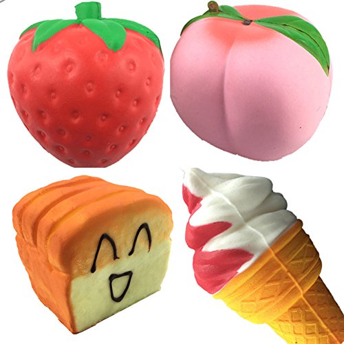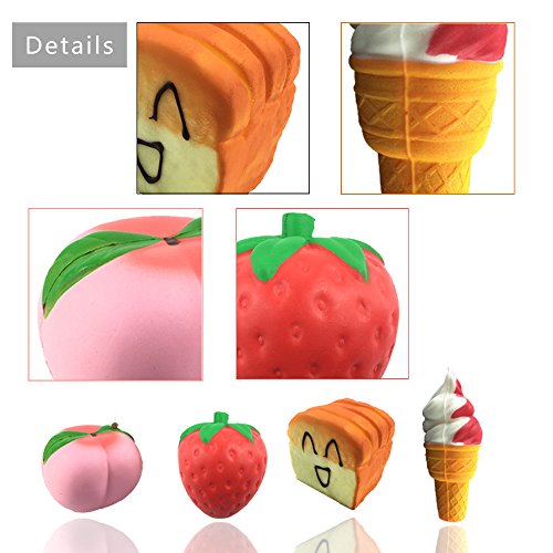Package including: 1 x Squishy Strawberry toy 1 x Squishy Peach toy 1 x Squishy Ice Cream toy 1 x Squishy Toast Bread toy