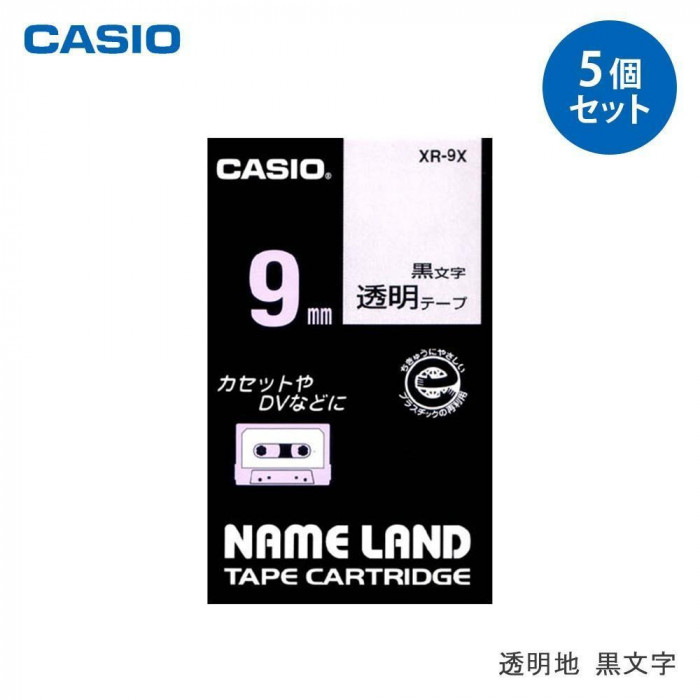 「ネームランド」用テープカートリッジです。デスクまわりの整理に使える9mm幅。 製造国:中国 素材・材質:樹脂 商品サイズ:テープ:長さ8m、幅9mm(1個あたり) 仕様:【色】テープ:透明、文字:黒 セット内容:5個セット ※サプライヤー直送品 ご注文後7~8営業日後の出荷となります【商品名】CASIO カシオ ネームランドテープ9mm幅 (透明地/黒文字) 5個 XR-9X-5P-E