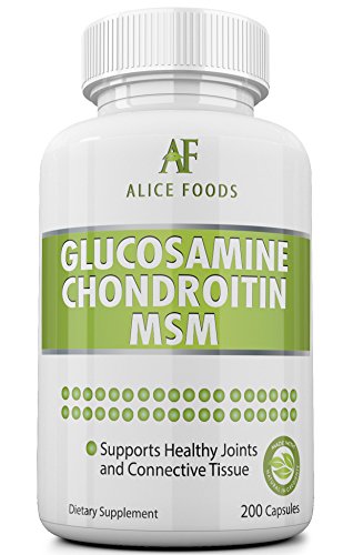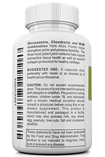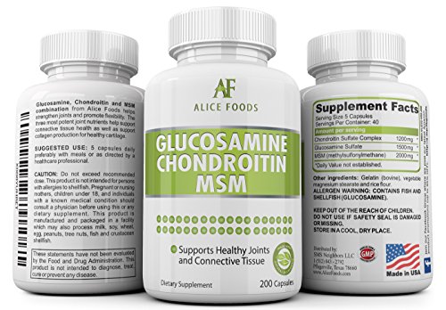 -. Feature : BETTER JOINT HEALTH AND CARE - Three of the world's best joint support ingredients are blended together in this Alice Food Health Supplement to give you an ultra-effective joint care formula. Joint problems are quite common as you grow older and could occur if you are an athlete or someone who indulges in intensive workouts, weightlifting or any other similar activities. / EXCELLENT PREVENTIVE MEASURE OR RECOVERY AID - Our Glucosamine Chondroitin MSM health supplement helps support and nourish connective tissues and cartilage. It even helps relieve any joint pain due to excessive exertion or fatigue and is considered to be better than a Placebo. Being rich in anti-inflammatory properties, it provides excellent pain relief for patients with osteoarthritis of the knee, hip and spine. / PERFECT PROPORTIONS - Glucosamine, Chondroitin and MSM are mixed together in a proportion that's close-to-magical for your joints. For dietary supplements, Glucosamine is harvested from shells of shellfish. Glucosamine and Chondroitin, both are major component of healthy cartilage and our supplement helps maintain them. MSM is a rich source of sulfur and helps in faster recovery of injured athletes and helps in production of healthy collagen. / OTHER BENEFITS - The Triple-Action Joint Protection formula also helps in Elbow Joint pain, finger joint pain or hip related discomfort and pain. Glucosamine helps stimulate new cartilage growth, chondroitin helps maintain valuable hydration and lubrication while MSM provides anti-inflammatory and pain relief actions. / 100% SAFE AND FDA APPROVED FACILITY - All Alice Food supplements are Made in USA at a GMP Certified, FDA inspected and approved facility. You can be completely confident that Alice Foods manufacturing processes are designed to give top P.R.Iority to your health such that you only benefit in every possible way. Available with Subscribe and Save