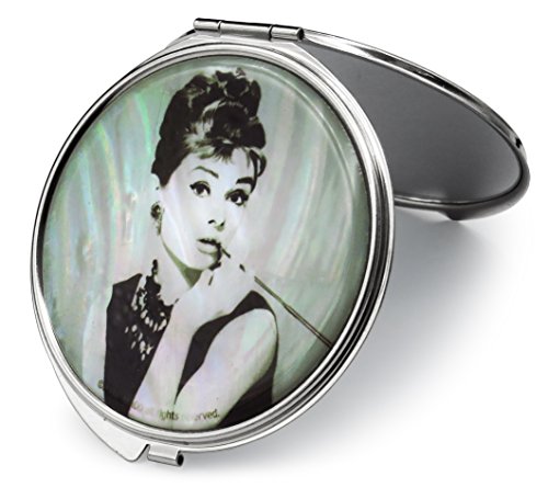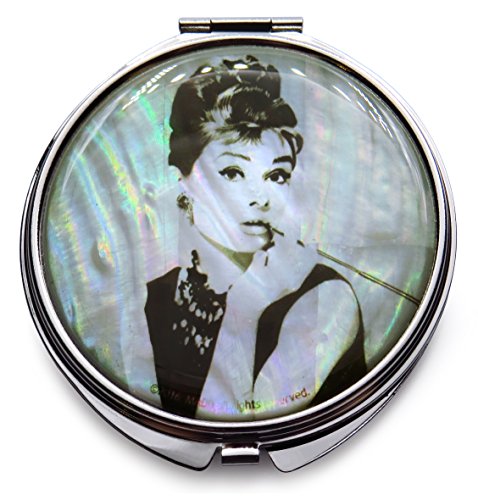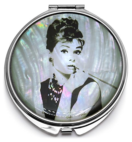 Audrey Hepburn Makeup Mirror Mother of Pearl Metal Dual Compact Folding Magnify (White)
